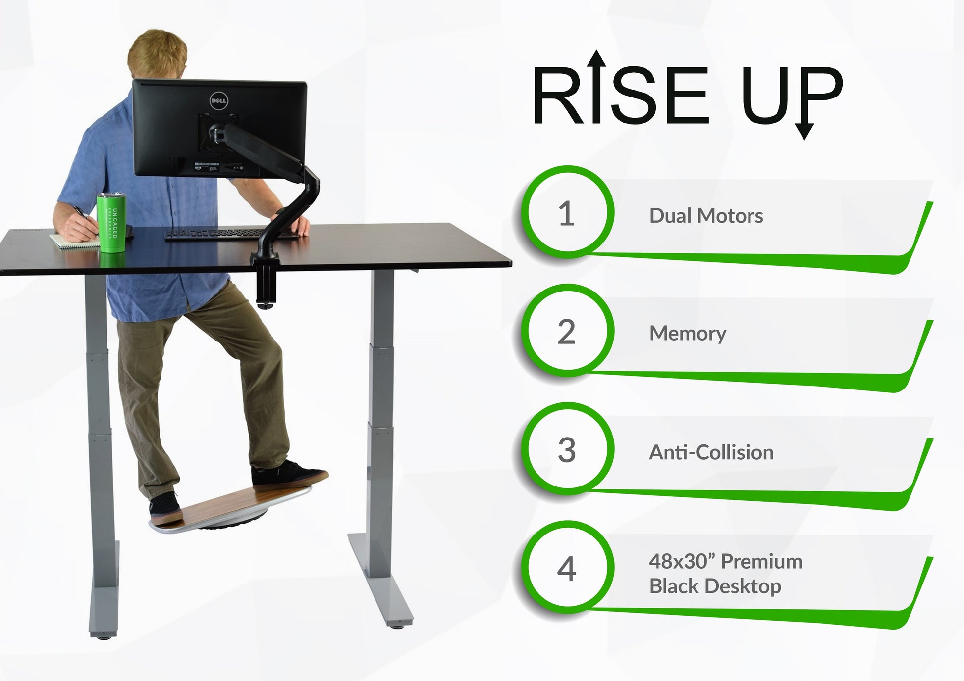 A premium electric adjustable height standing desk with a compact 48x30" black desktop. Feel more invigorated, creative, and healthy as you effortlessly transition between sitting and standing. Stop hunching - perfect your seated and standing posture by customizing desk height to fit your physique. Since ~2010, Uncaged Ergonomics has built every Rise Up standing desk with durable, custom-engineered, premium components that have been proven in the field for over a decade.