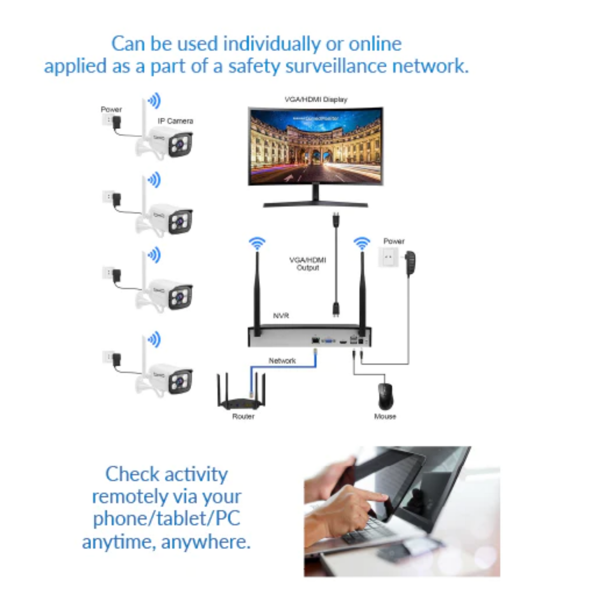 Accessories: Manual, NVR System, and Power Supply, 4x IP Cameras with Power Supplies, and Antenna Extension Cord